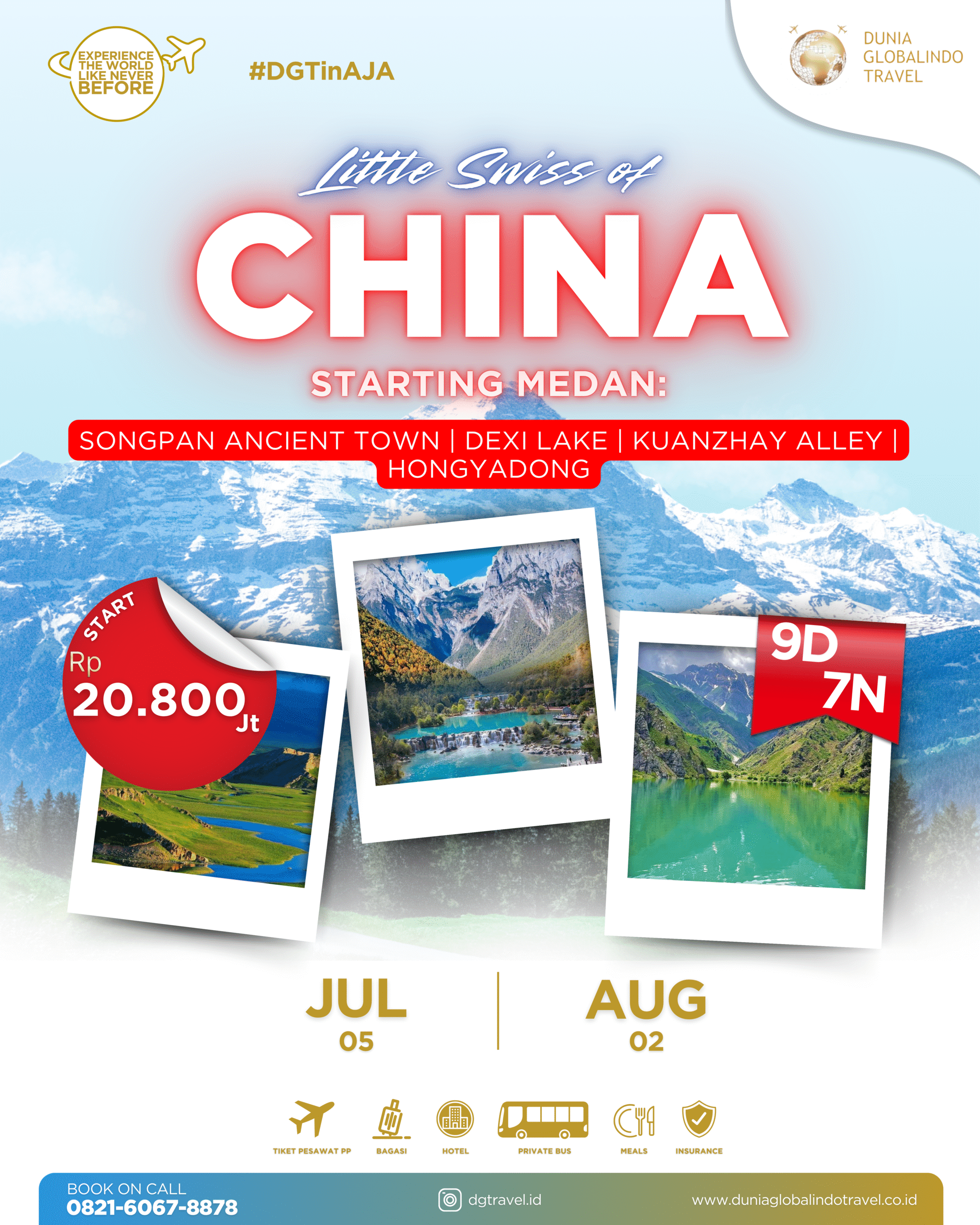Temukan keindahan menakjubkan ala Eropa di jantung Asia bersama Little Swiss of China! Nikmati liburan eksklusif 9 hari 7 malam mulai dari Medan, menjelajahi destinasi memukau seperti Songpan Ancient Town, Dexi Lake, Kuanzhay Alley, hingga Hongyadong. Dengan harga mulai Rp20,8 juta, Anda akan mendapatkan paket lengkap termasuk tiket PP, hotel, bus pribadi, makan, dan asuransi. Berangkat 5 Juli & 2 Agustus – siapkah Anda menjelajah Tiongkok dengan nuansa Swiss yang memikat?